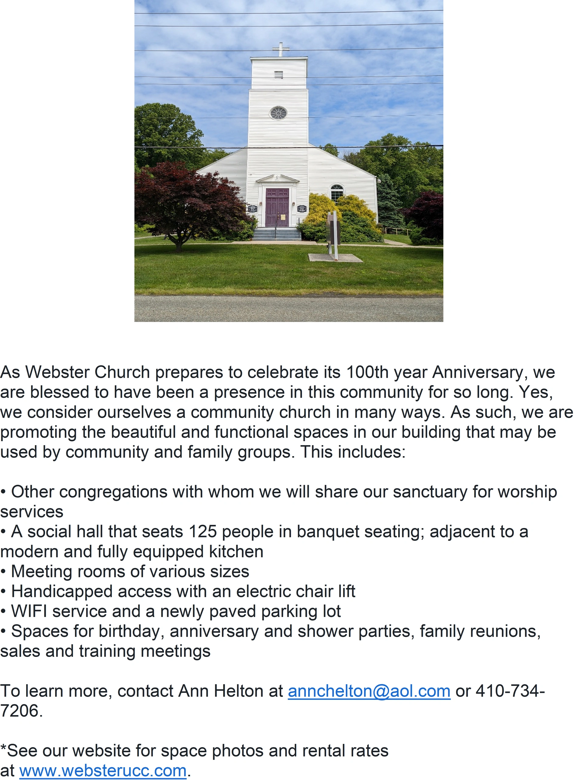 First and foremost, we are a people of extravagant welcome. Webster Congregational Christian Church of the United Church of Christ, is an inclusive community, united by our faith in God and our call to be disciples of Jesus Christ. Guided by the Spirit, we welcome and celebrate diversity that God has chosen to create and love. We strive to honor the great commandments: to love God above all else and to love our neighbors as ourselves.